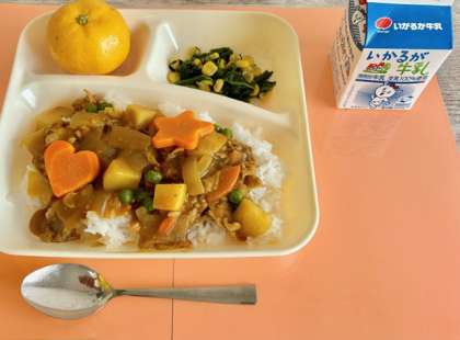 【ポークカレーライス、ほうれんそうのソテー、みかん、牛乳】