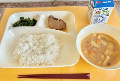 【ごはん、なまりぶしのしょうが煮、なめこのみそ汁、ほうれんそうのごまあえ、牛乳】