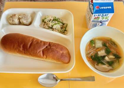 【黒糖パン、焼きシューマイ、中華みそスープ、ツナと野菜のオイスターソースいため、牛乳】