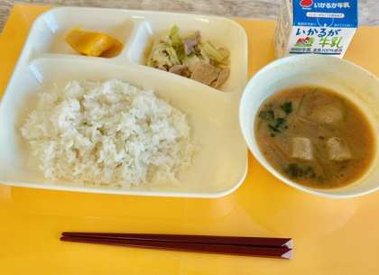 【ごはん、豚肉と野菜のいためもの、いわしのつみれ汁、かぼちゃういろう、牛乳】