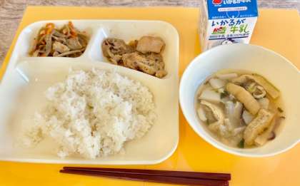 【ごはん、鶏肉の梅風味焼き、うすくず汁、きんぴらごぼう、牛乳】
