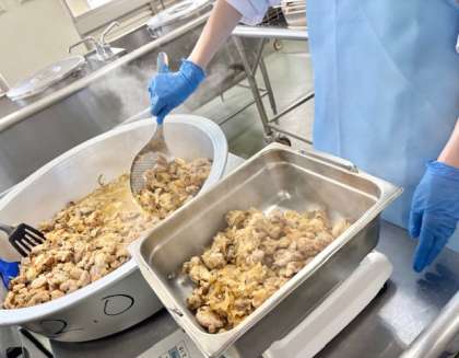 鶏肉の梅風味焼きは、梅肉、砂糖、料理酒、こいくちしょうゆで下味をつけた鶏肉に、たまねぎを混ぜ合わせ、焼き物機で焼いています。(写真2枚目)