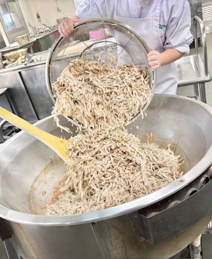 きんぴらごぼうは、豚肉、ごぼう、にんじんをいため、砂糖、こいくちしょうゆで味つけしています。(写真3枚目)