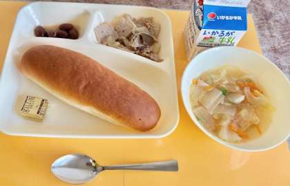 【コッペパン、バター、豚肉のバジル焼き、スープ、うずら豆のグラッセ、牛乳】