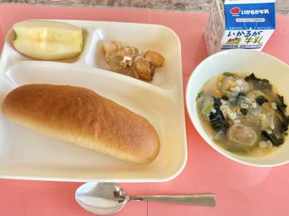 【黒糖パン、さけのマリネ、肉だんごと押麦のスープ、りんご、牛乳】