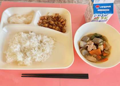 【ごはん、鶏肉と野菜の煮もの、じゃこ豆、かぶのゆず風味、牛乳】
