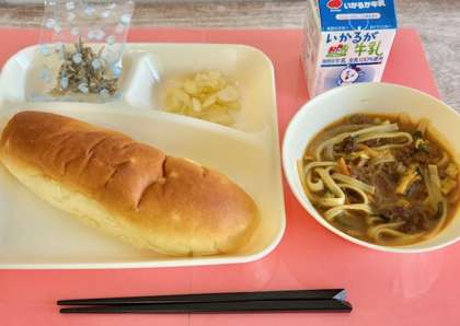 【おさつパン、カレーうどん、はくさいのおひたし、ミニフィッシュ、牛乳】