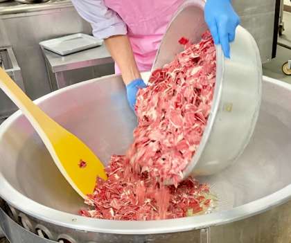 カレーうどんは、牛肉(写真2枚目)を主材に、うすあげ、たまねぎ、にんじん、青みに青ねぎを使用しています。寒い日に体があたたまる一品です。