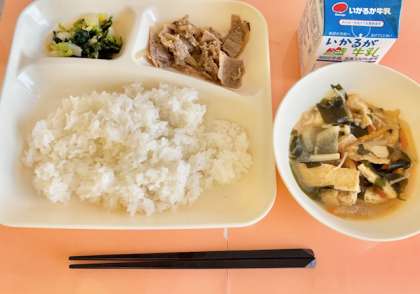 【ごはん、豚肉のごまだれ焼き、みそ汁、きくなとはくさいのおひたし、牛乳】