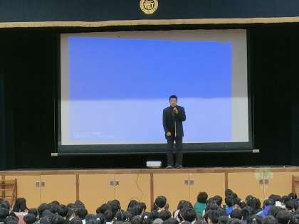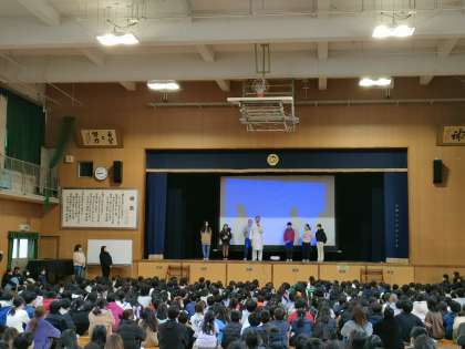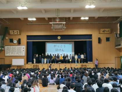 児童朝会の時間を使って、給食委員が、児童代表として給食調理員に日頃の感謝の気持ちを伝えました。その後、保健委員が、歯についての発表を行い、学校歯科医の近藤先生に講評をいただきました。