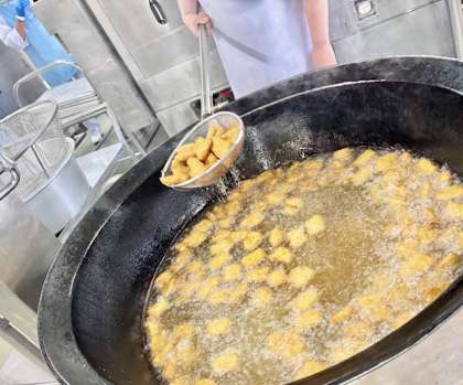 カツ丼は、たまねぎ、にんじん、青ねぎを煮て味つけし、卵を流し入れて仕上げた具をごはんにかけ、1人1個の一口トンカツをのせていただきます。(写真2、3枚目)