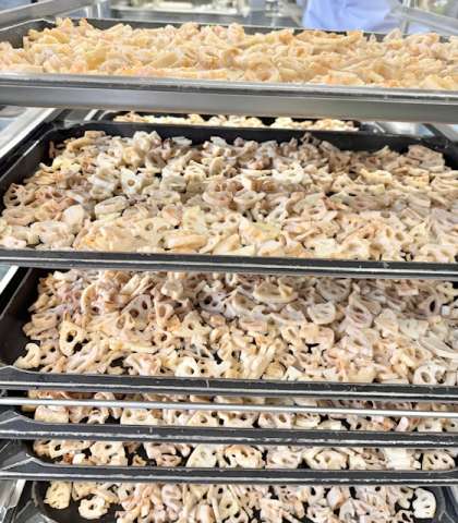 焼きれんこんは、塩と綿実油で下味をつけた冬野菜のれんこんを焼き物機で焼いています。