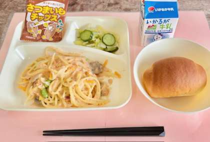 【ミニコッペパン、さけのクリームスパゲッティ、キャベツときゅうりのサラダ、おさつチップス、牛乳】