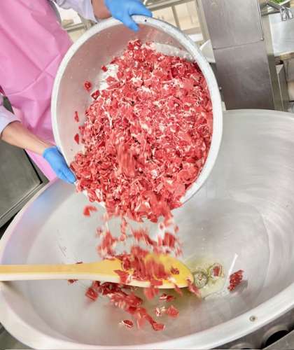 ビーフシチューは、ケチャップ、トマトピューレ、トンカツソース、チキンブイヨンなどで味つけし、上新粉でとろみをつけ、煮込んでいます。(写真2枚目)