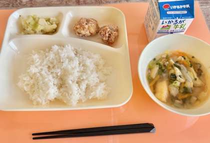 【ごはん、鶏肉のたつたあげ、五目汁、キャベツの梅風味、牛乳】