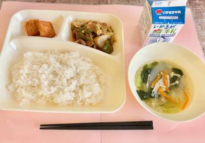 【ごはん、ホイコウロー、中華スープ、あつあげのピリ辛じょうゆかけ、牛乳】