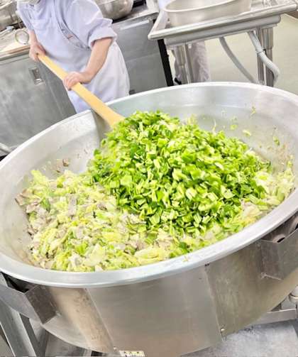 中華スープは、鶏肉、たまねぎ、にんじん、えのきたけ、青みにチンゲンサイを使用し、塩、こしょう、うすくちしょうゆ、中華スープの素で味つけしたスープです。