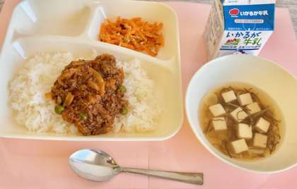 【タコライス、とうふともずくのとろり汁、にんじんしりしり風、牛乳】