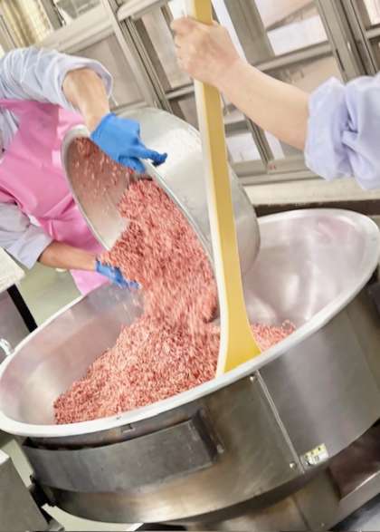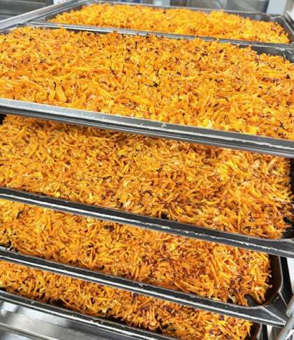にんじんしりしり風は、令和五年度学校給食献立調理検討会議で開発された献立です。油漬けのささみ、にんじん、かつおぶしに、みりん、うすくちしょうゆで作った調味液を混ぜ合わせ、焼き物機で焼いています。(写真3枚目)