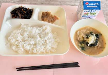 【ごはん、あかうおのしょうゆだれかけ、みそ汁、ひじきのいため煮、牛乳】