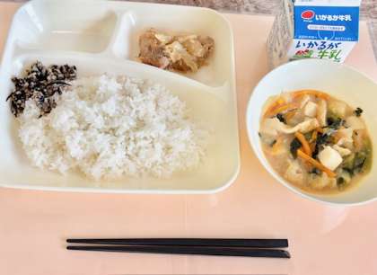 【ごはん、鶏肉の甘辛焼き、みそ汁、魚ひじきそぼろ、牛乳】