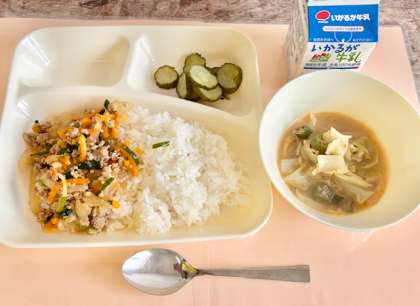 【豚ひき肉とにらのそぼろ丼、みそ汁、きゅうりのゆず風味、牛乳】