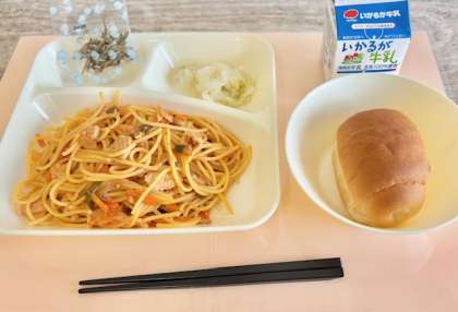 【ミニコッペパン、チキントマトスパゲッティ、キャベツのピクルス、ミニフィッシュ、牛乳】