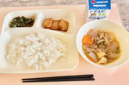 【ごはん、みそ肉じゃが、あつあげのしょうがじょうゆかけ、オクラのおかかいため、牛乳】
