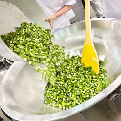 オクラのおかかいためは、オクラをいため、みりん、こいくちしょうゆ、粉末のかつおぶしで味つけしています。(写真3枚目)