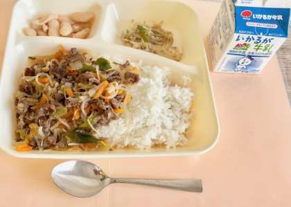【牛丼、もやしとピーマンのごまいため、大福豆の煮もの、牛乳】