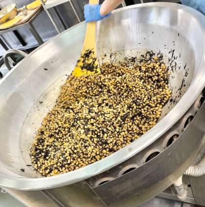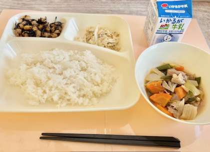 ひじき豆は、でんぷんをまぶして油であげた大豆に、ひじきが入った甘辛い調味液をからませています。鉄や食物繊維を多く含む献立です。(写真2枚目)