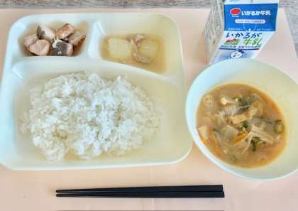 【ごはん、さけのつけ焼き、みそ汁、とうがんの煮もの、牛乳】
