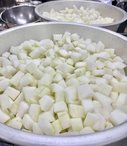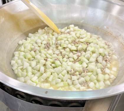 とうがんの煮ものは、夏が旬のとうがんをしょうがの風味をきかせただしで煮ています。鶏肉ととうがんだけのシンプルな組み合わせにしています。(写真2、3枚目)