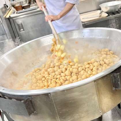 鶏肉と一口がんもの煮ものは、鶏肉、一口がんも、じゃがいも、たまねぎ、にんじん、青みにさんどまめを使用しています。(写真1枚目)
