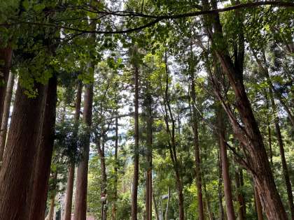 青空の下、ハチ高原の木陰にてお弁当を食べています。
