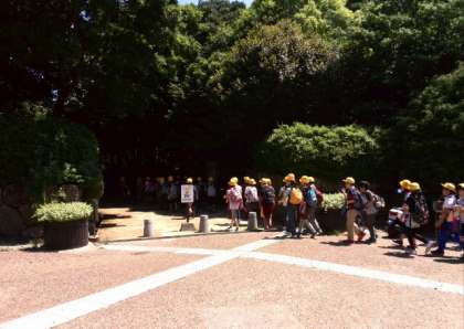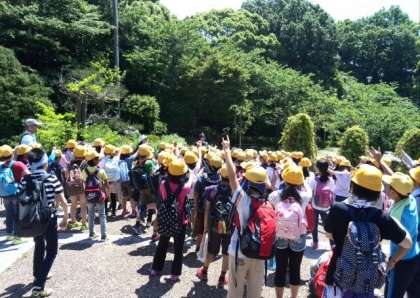 先生のかけ声のもと、気合いをいれました。さあ、山登りスタートです!