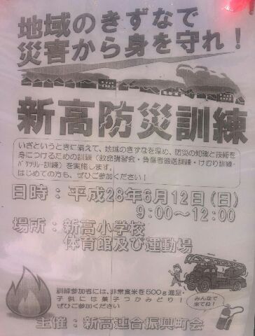 明日、新高小学校にて地域の防災訓練が実施されます。