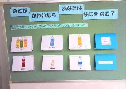 「からだのために良い飲み物は何か」についてわかりやすく理解できるよう、養護教諭がステキな掲示物を作ってくれました。