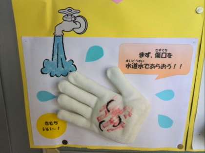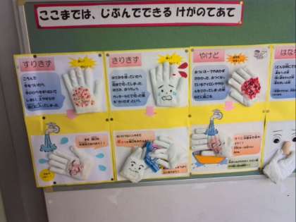 怪我をした時に、「子どもたちが自分でできるてあて」をわかりやすく掲示してくれています。