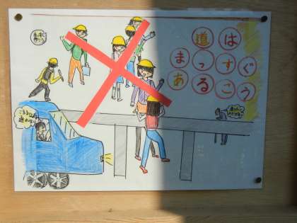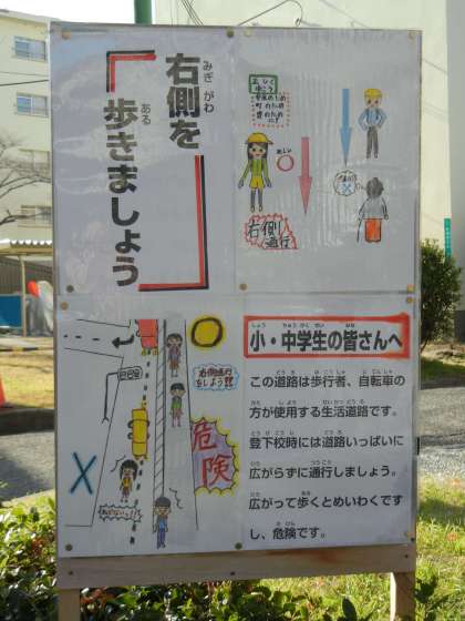 新高南住宅のご厚意で、東側道路に「右側通行をしましょう」の看板を設置していだきました。子どもたちが広がって歩くために自転車・車に迷惑をかけていました。ありがとうございます。
