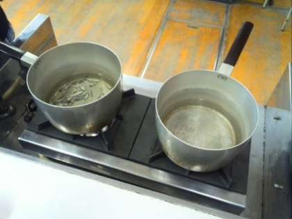 うま味が十分に出るいりこだしの取り方を学んでいます。