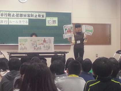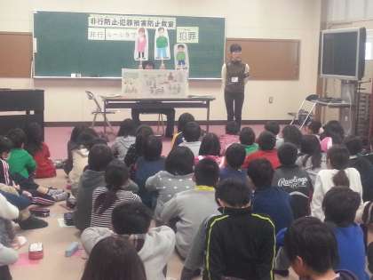 人形劇を見て、「ルールを守ること」「思いやりの気持ちをもつこと」「非行に誘われたら断る勇気」などについて学びました。