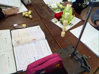 おもりをつるす位置や、おもりの重さを変えて、どんな時につりあうのかを実験中。