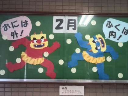 学校の掲示物も節分仕様に…。