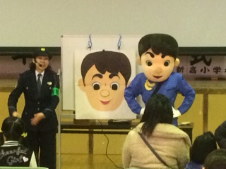 本日、PTA主催の防犯教室が行われました。淀川警察署防犯係・生活安全指導係の方々にも来ていただき、お話を聞きました。特別ゲストとして「ゆうかいするぞう」さんにも来ていただき、どんな子どもが誘拐しやすいのか話を聞いたところ、「一人でいる子ども」「お金をあげようかと言ったらついてくる子ども」などという答えが。