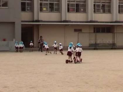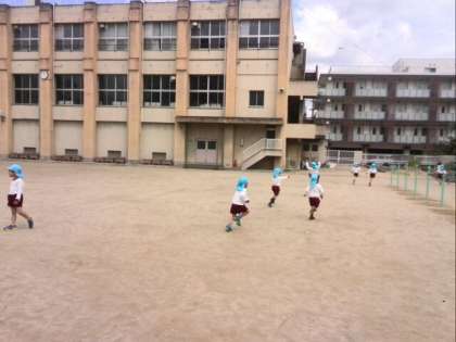 隣接する新高幼稚園の園児が、新高小学校の校庭で遊んでいます。
