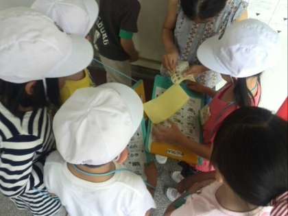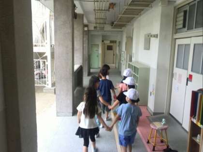 2年生が1年生と手をつなぎ、やさしく校内を案内してくれています。