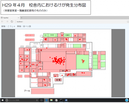 けが情報を登録することで、校内のどこでけがが多いかなどをビジュアルで示すことができます。