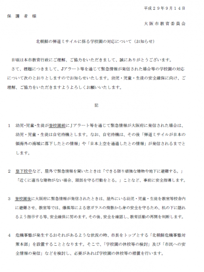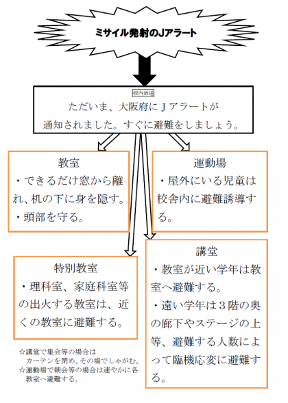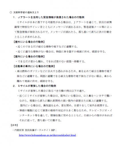 Jアラートの対応について、本日保護者のみなさまにお子様を通じて文書をお渡ししております。