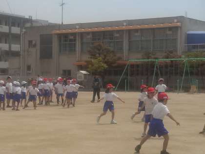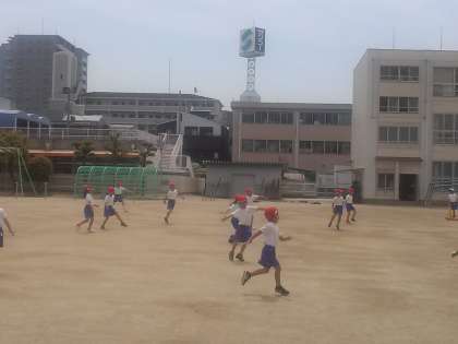 4クラスで合同体育、運動場デビューです